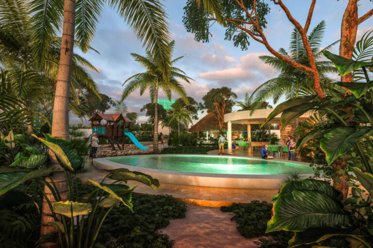 4. área de juegos infantiles 5. palapa-bar 6. alberca de adultos 7. área de asador