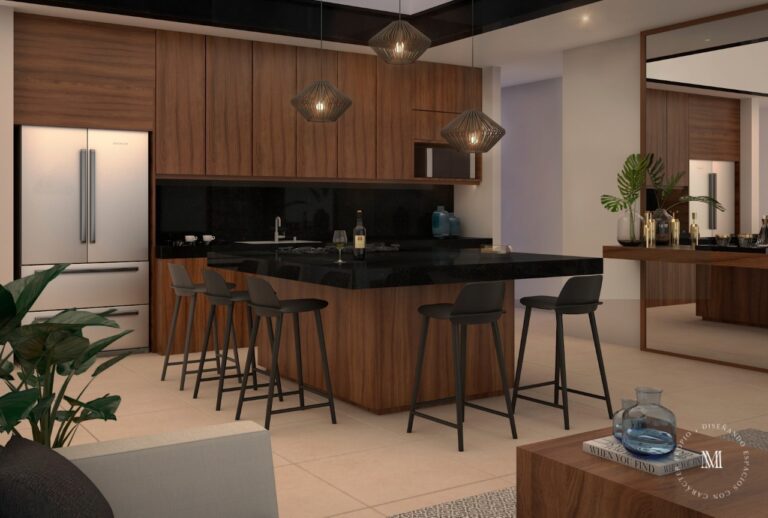 - Isla con estufa y barra desayunador acabado en madera de cedro con cubierta de granito (Santo Tomás)